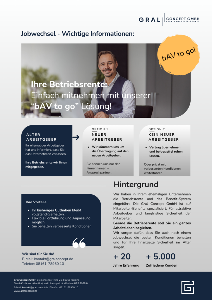 Wir haben in Ihrem ehemaligen Unternehmen die Betriebsrente und das Benefit-System eingeführt. Die Gral Concept GmbH ist auf Mitarbeiter-Benefits spezialisiert. Für attraktive Arbeitgeber und langfristige Sicherheit der Mitarbeiter.
